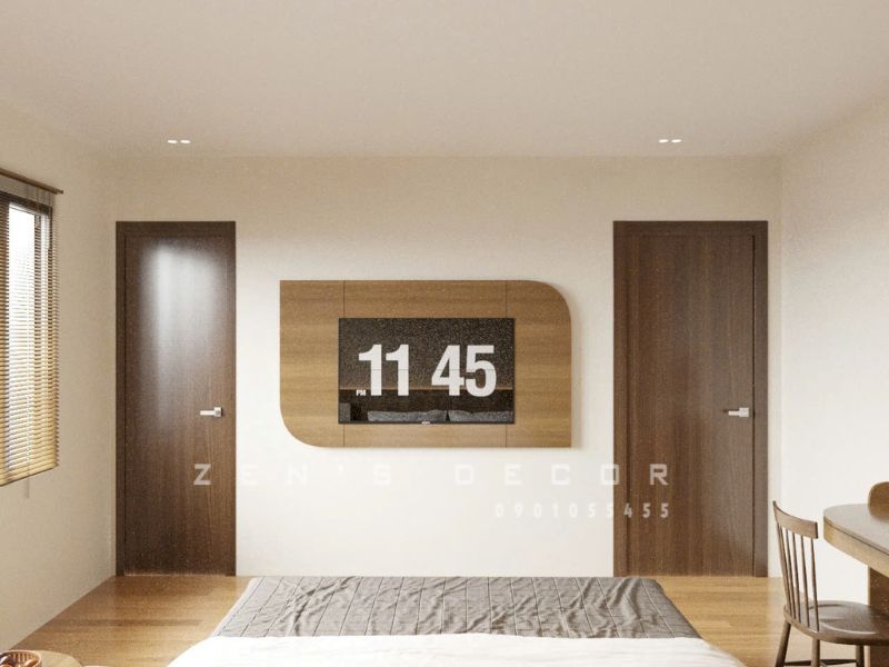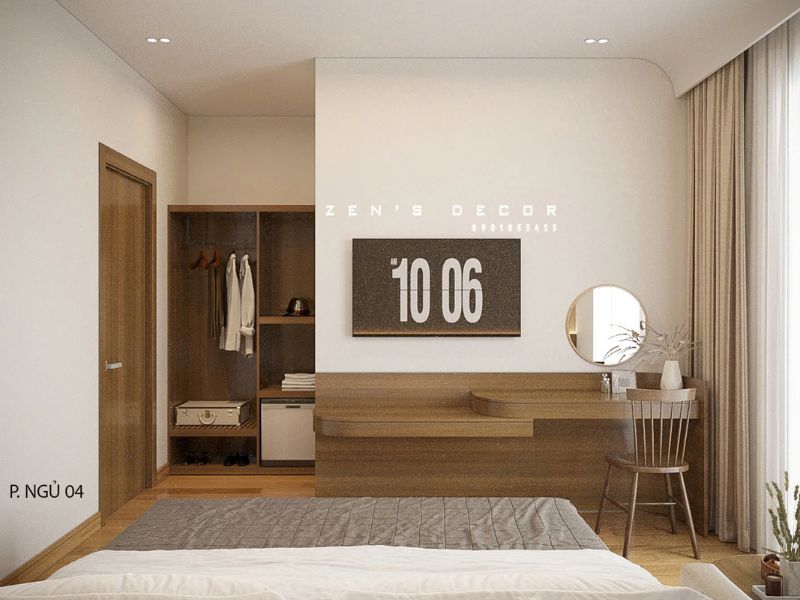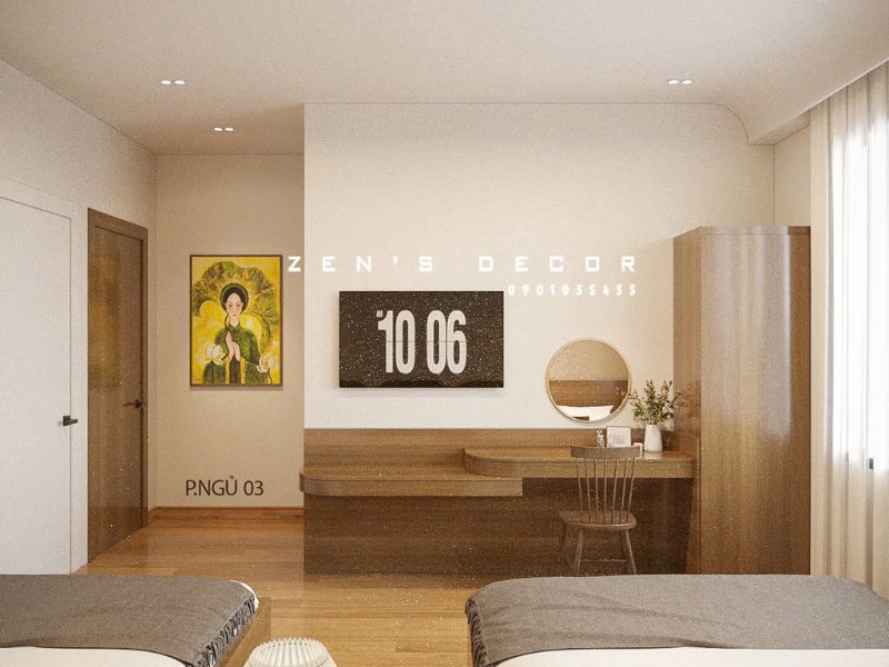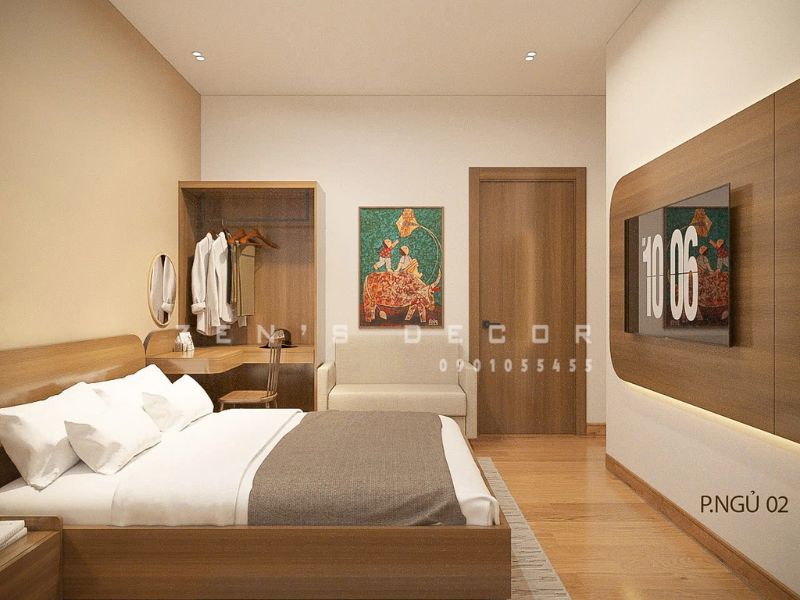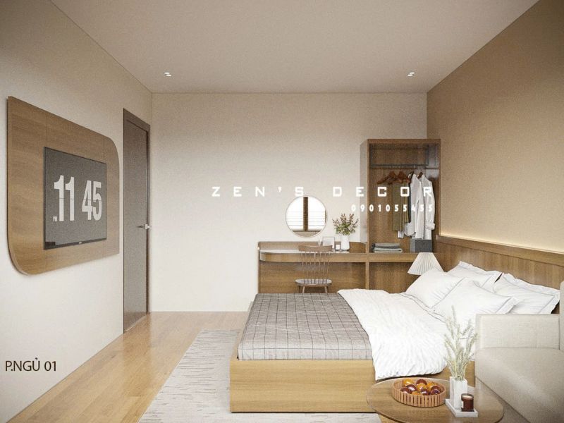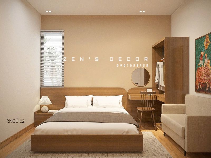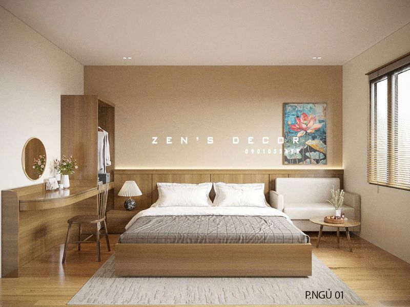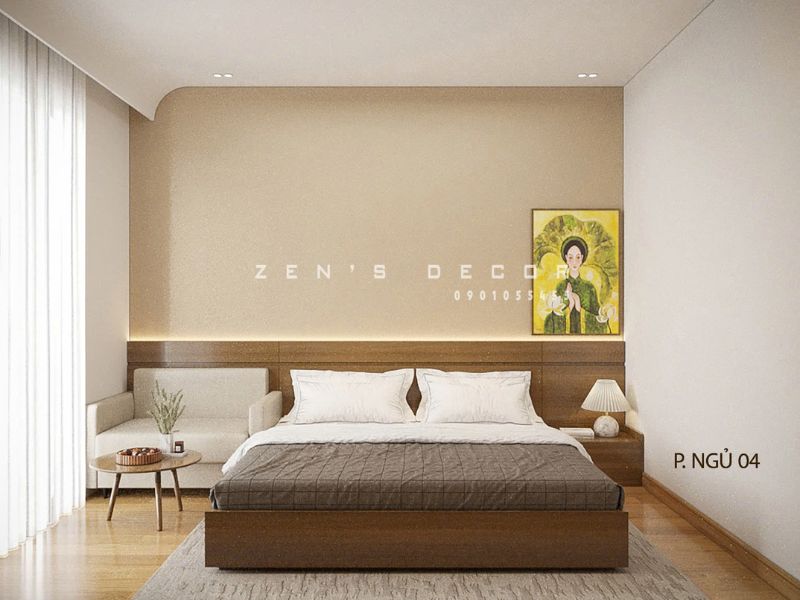 Sử dụng tông màu be, kem và trắng làm chủ đạo, kết hợp với màu gỗ tự nhiên ấm áp. Tường đầu giường (tường nhấn) được sơn màu be đất giúp tạo cảm giác tĩnh lặng, êm dịu, hỗ trợ giấc ngủ sâu.