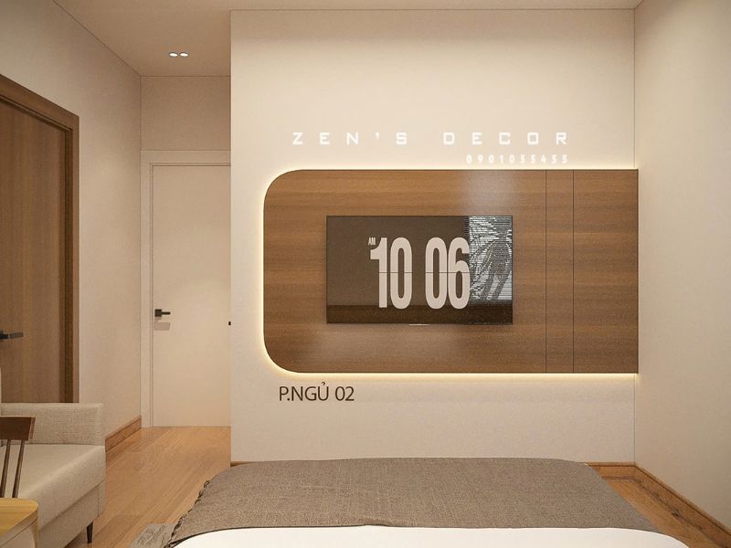 Giường ngủ được đặt ở trung tâm, với thiết kế giường hộp thấp, vững chắc, tạo cảm giác hiện đại và thư thái. Vách ốp đầu giường sử dụng mảng gỗ lớn kết hợp với đèn LED hắt sáng ẩn (cove lighting). Thiết kế này không chỉ nâng tầm thẩm mỹ mà còn tạo ra một "hộp" ánh sáng ấm áp, cực kỳ thích hợp cho sự lãng mạn và yên tĩnh vào ban đêm.