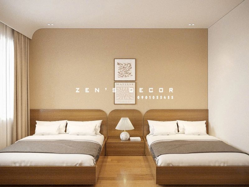 Đối với nhóm khách du lịch hoặc gia đình có con lớn, việc bố trí hai giường đơn lớn (twin beds) như trong phòng ngủ này là giải pháp tối ưu, đảm bảo mỗi người đều có không gian riêng tư