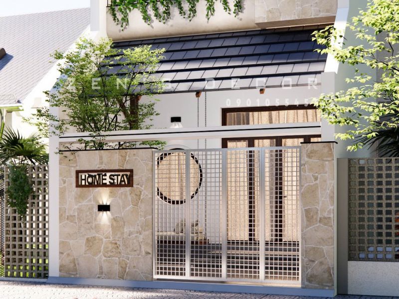 Mặt tiền là bộ mặt của homestay, là yếu tố quyết định liệu khách hàng có dừng lại và lựa chọn bạn giữa vô vàn đối thủ cạnh tranh hay không. Như mẫu thiết kế tiêu biểu dưới đây, phong cách hiện đại được thể hiện qua các đường nét kiến trúc mạnh mẽ, dứt khoát