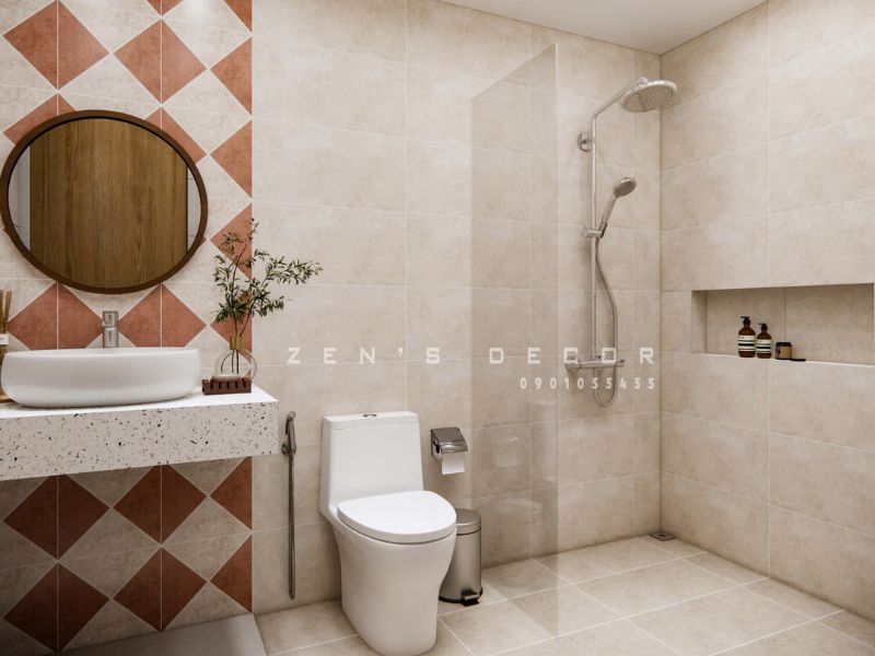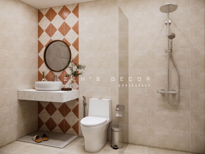 Thay vì chỉ sử dụng gạch đơn sắc, phòng tắm có thể được nhấn nhá bằng một mảng gạch có họa tiết hình học, màu sắc nổi bật (như họa tiết quả trám màu đỏ cam/nâu đất trong Image 6), tạo nên sự khác biệt và dễ "nhận diện thương hiệu" cho homestay.
