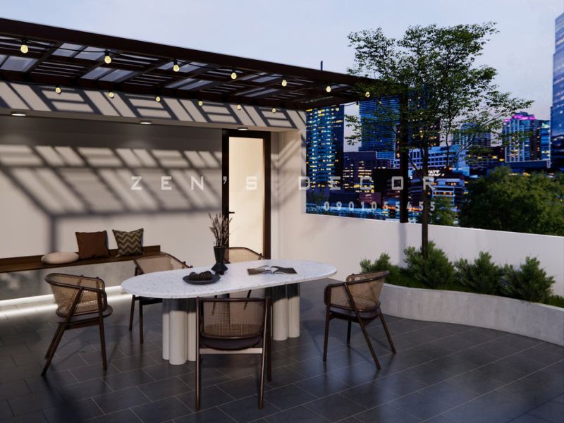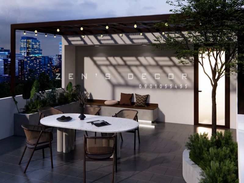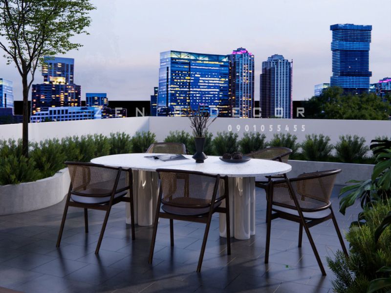 Khu Vực Ăn Uống Ngoài Trời Sang Trọng: Trung tâm sân thượng là một bộ bàn ăn ngoài trời tinh tế, có thể là mặt bàn đá Terrazzo trắng kết hợp với chân đế điêu khắc (pedestal base), cùng với những chiếc ghế mây tre đan hiện đại. Khu vực này lý tưởng cho bữa sáng, tiệc trà chiều, hoặc bữa tối lãng mạn dưới ánh đèn.