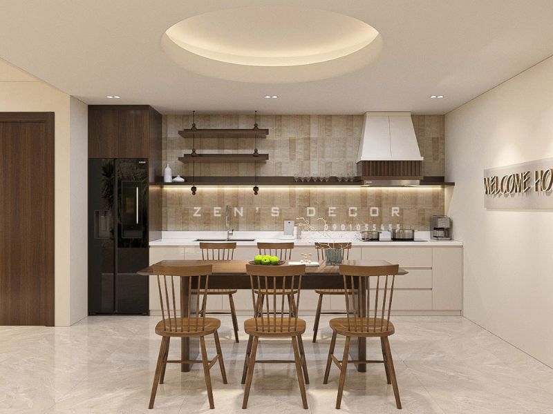 Thay vì sử dụng gạch men trắng lạnh, khu vực backsplash (tường bếp) sử dụng gạch ốp hoặc vật liệu vân đá, màu be ấm áp, kết hợp với ánh sáng vàng dịu nhẹ từ đèn LED âm tủ. Điều này tạo ra một không gian ấm cúng, mời gọi hơn.