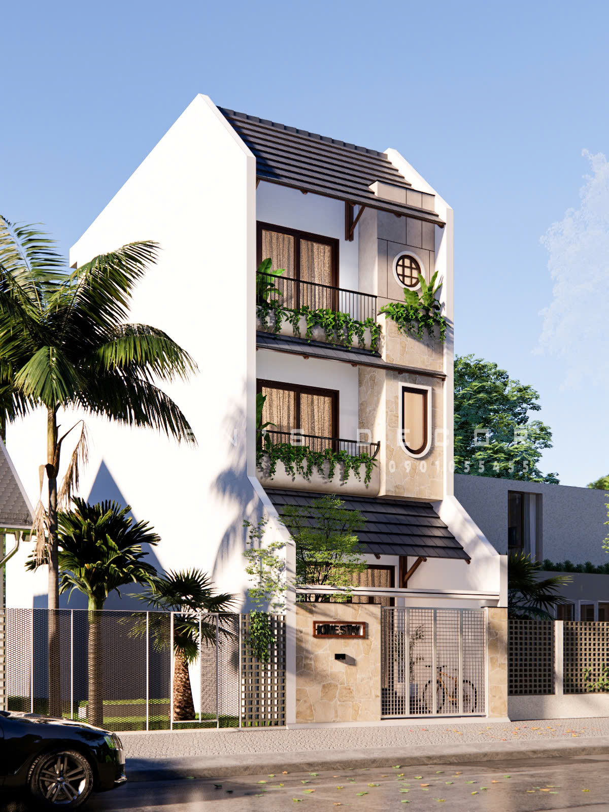 Với đặc điểm nhà phố hoặc khu đất hẹp, thiết kế nhiều tầng là giải pháp thông minh để tăng số lượng phòng và công suất đón khách. Sự kết hợp hài hòa giữa gam màu trắng chủ đạo và các mảng màu trung tính (như xám, nâu đen của mái và lan can) tạo nên vẻ ngoài thanh lịch, sang trọng.