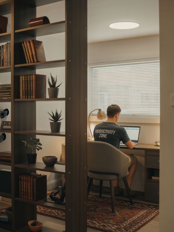 Ánh sáng trong phòng làm việc kiêm phòng đọc sách cần được thiết kế theo nguyên tắc "đa lớp" (Layered Lighting):