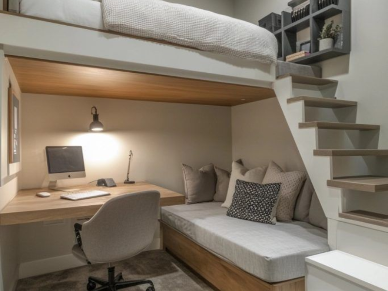 Việc kết hợp giường tầng với các chức năng khác như tủ quần áo, bàn làm việc hay khu vực nghỉ ngơi đọc sách giúp tối đa hóa diện tích sử dụng và tạo nên một không gian sống đầy tiện nghi.
